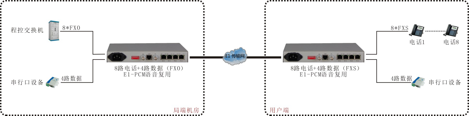 8路PCM+4路数据(电源内置)E1语音复用