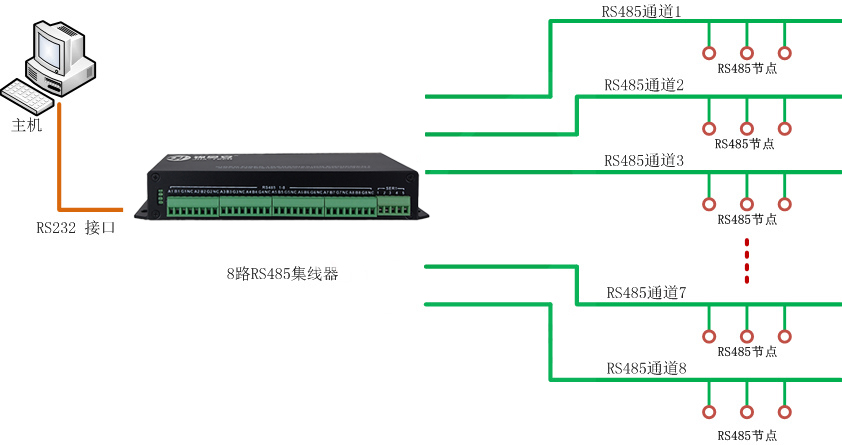 8通道RS485隔离集线器每个端口都自适应0~115200bps 的波特率,所有通道均在相同的波特率下工作,通道传输延时非常小。符合RS485标准,支持透明的,协议独立的RS485 消息传输,使其适用于多种应用,如Modbus 协议等。如果要将PC等监控设备连入网络,8通道RS485隔离集线器上联口可以配置RS232 端口,使您无需安装额外的RS485转RS232 转接设备。当雷击或者设备故障产生时,出现问题的网段将被隔离,以确保其他网段的正常工作。这一性能大大提高了现有 RS-485 网络的可靠性,有效缩短了网络的维护时间。
