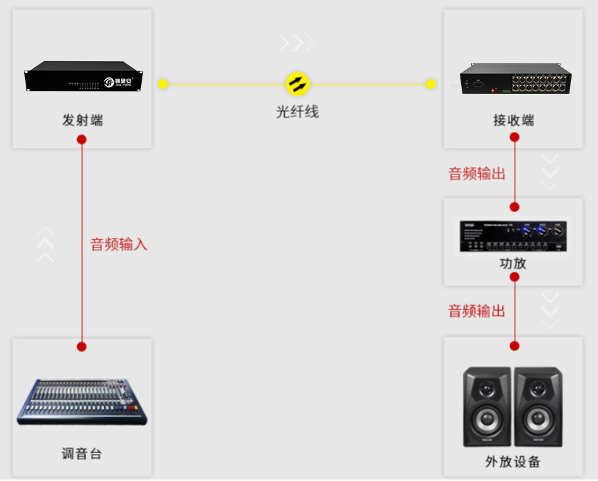 JHA-DCN16A该产品是一种把传统三芯模拟音频通过发射机转换为光信号通过光纤传输,接收机接收信号再次转换为三芯模拟音频的一种光纤长距离传输设备。前端平衡音频信号直接输入,经过光纤传输从后端输出接有源音箱或者接功放驱动喇叭。采用16bit数字音频编码,系统指标达到或超过广播甲级标准。它具有传输距离远,抗干扰性强,无衰减等很多优点因此在现场环境中被大量弱电工程商使用。