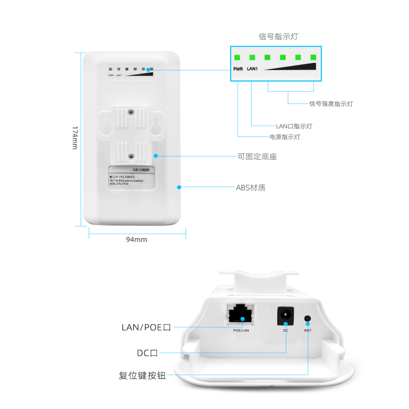 JHA-WQE450C是一款5.8G 450M的室外远距离无线AP网桥,支持11AC协议,内置14dBi高增益定向天线,AP模式/客户端模式功能,适用于无线组网和无线覆盖, 此款采用防尘防水外壳和天线,能在各种室外环境下工作,空旷环境传输3KM、还支持DC 12V/POE24V双供电功能,方便施工安装。